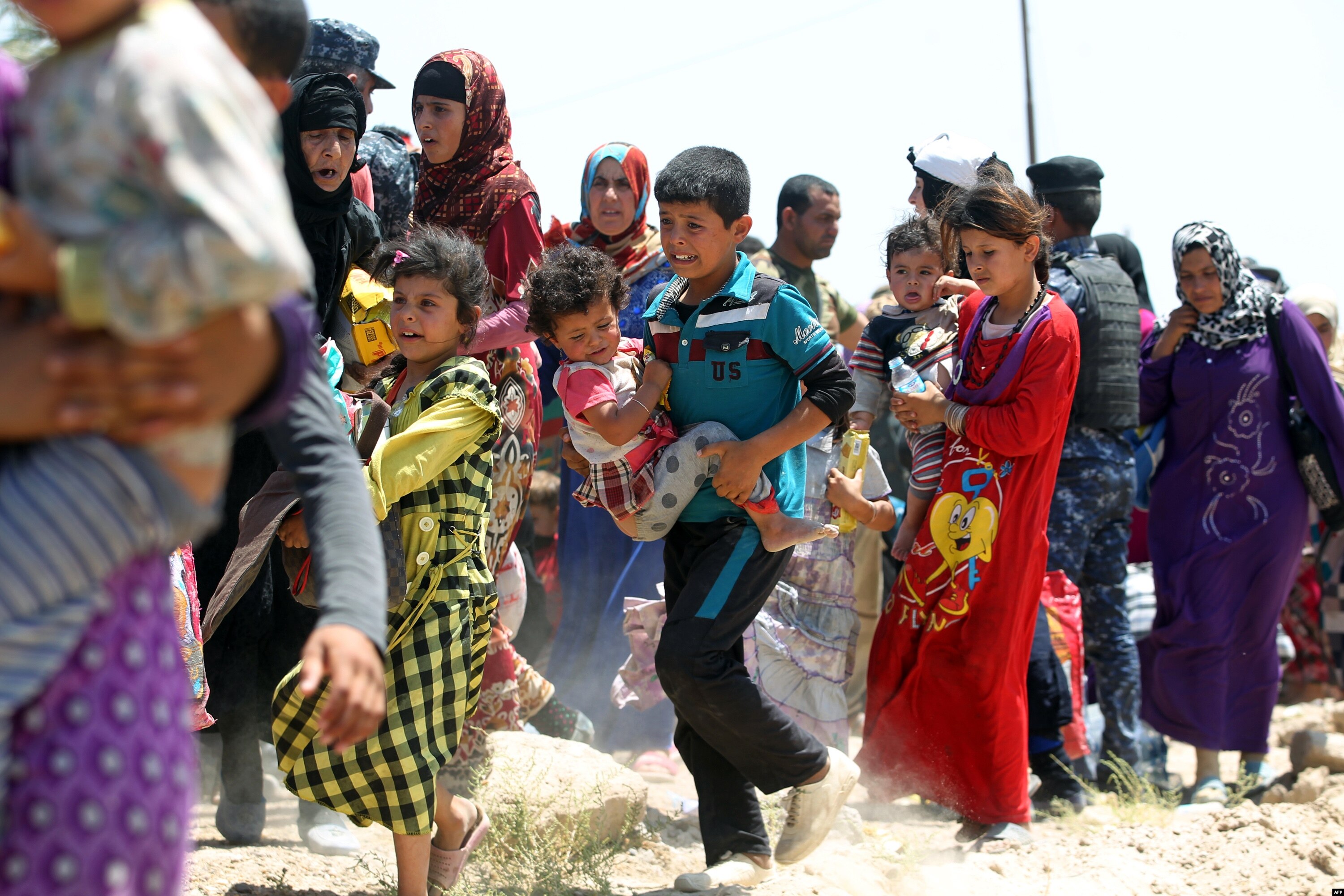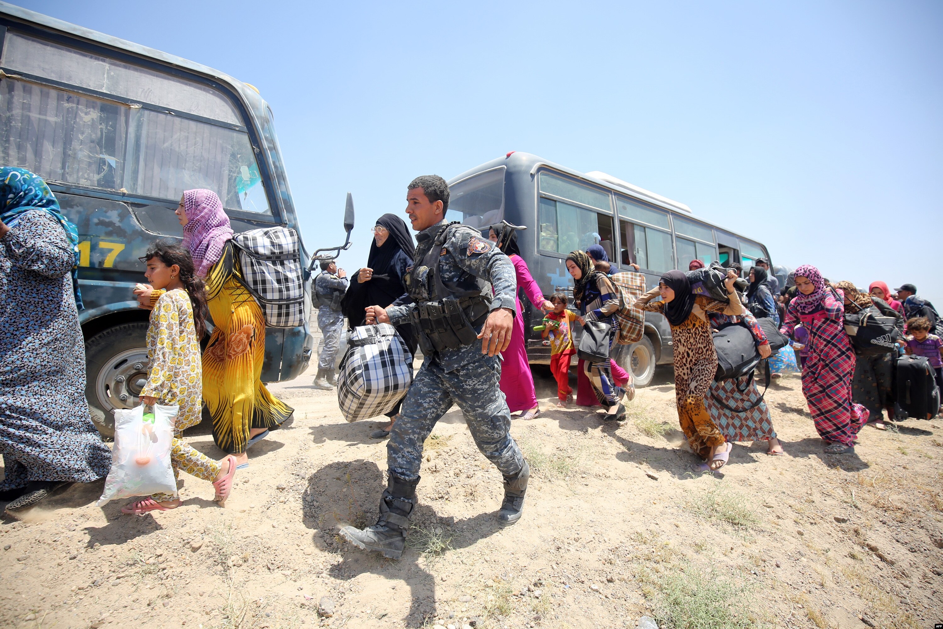Iraqi families are seen near al-Sejar village in Anbar province, after fleeing the city of Fallujah, May 27, 2016, during a major operation by pro-government forces to retake the city from the Islamic State (IS) group.